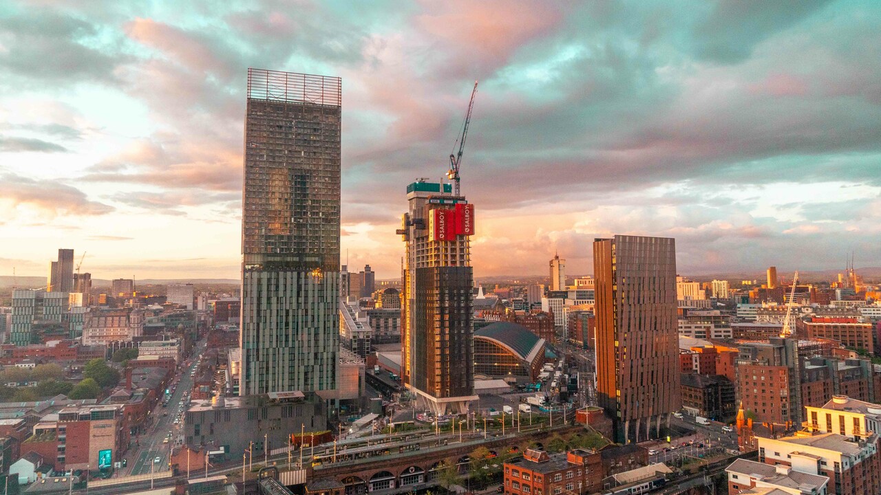 Aerial view of city skyscrapers and buildings at sunset, with a construction crane visible on one high-rise.