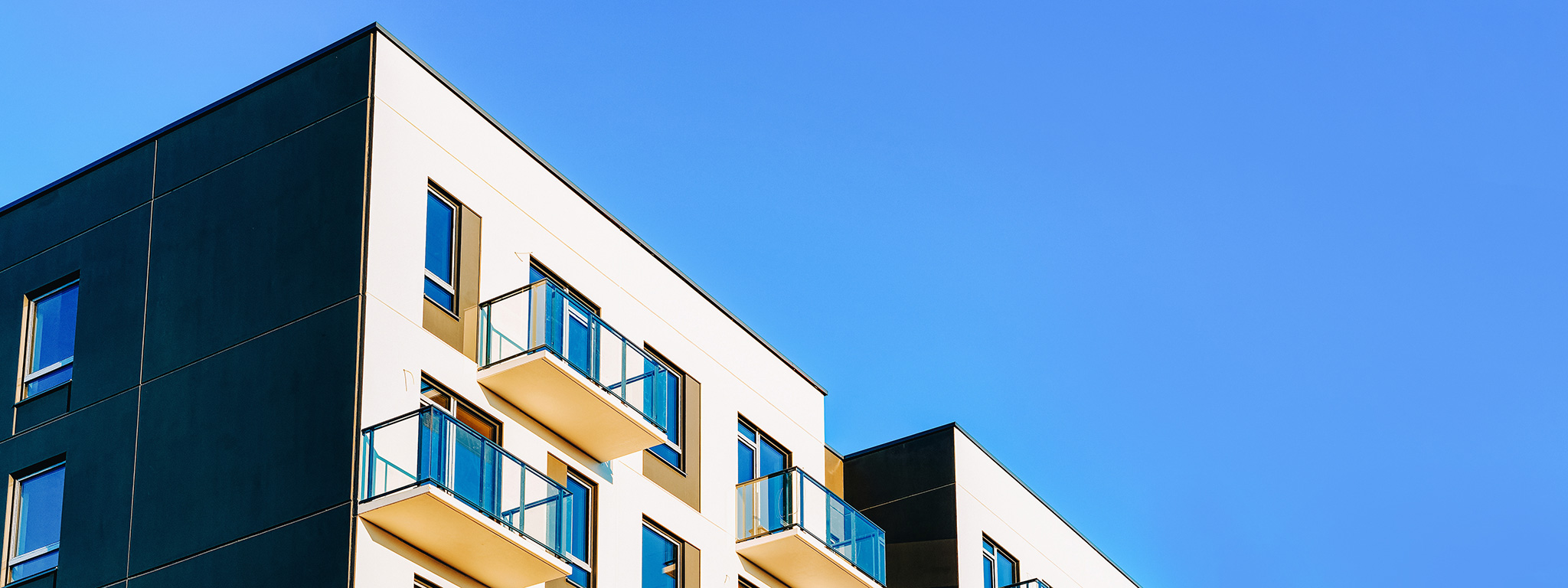 Modern apartment building with balconies against a clear blue sky. Dark and light-coloured exterior walls contrast under bright daylight.
